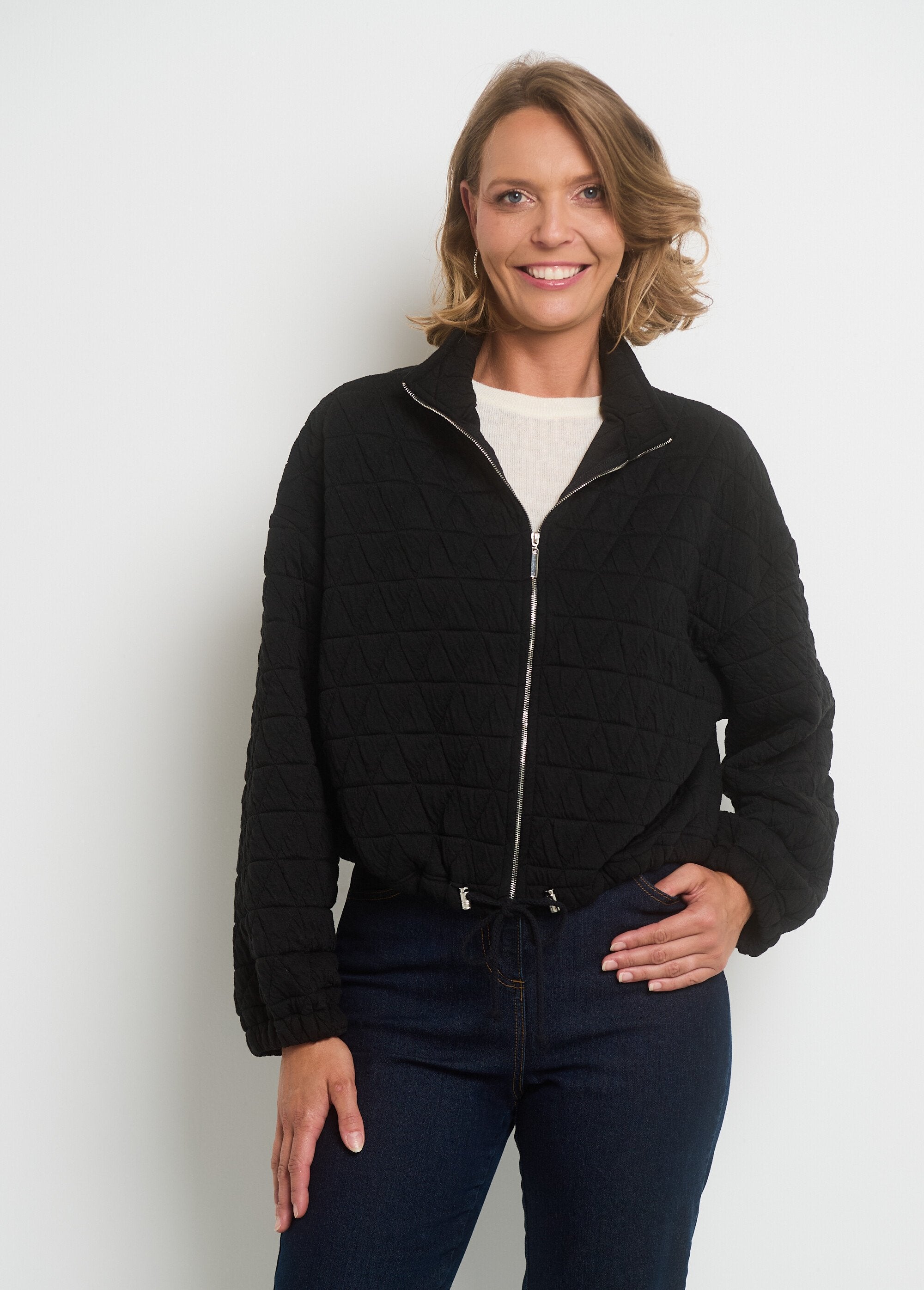 This short, quilted zip jacket with stand-up collar combines style and functionality. The bottom of the jacket features metallic stoppers for a customized fit, while its soft knit ensures optimal comfort. Its original topstitching not only enhances its durability but also adds a distinctive aesthetic detail. Perfect for cooler days, this jacket combines warmth and elegance, ideal for everyday wear or mid-season outdoor activities.