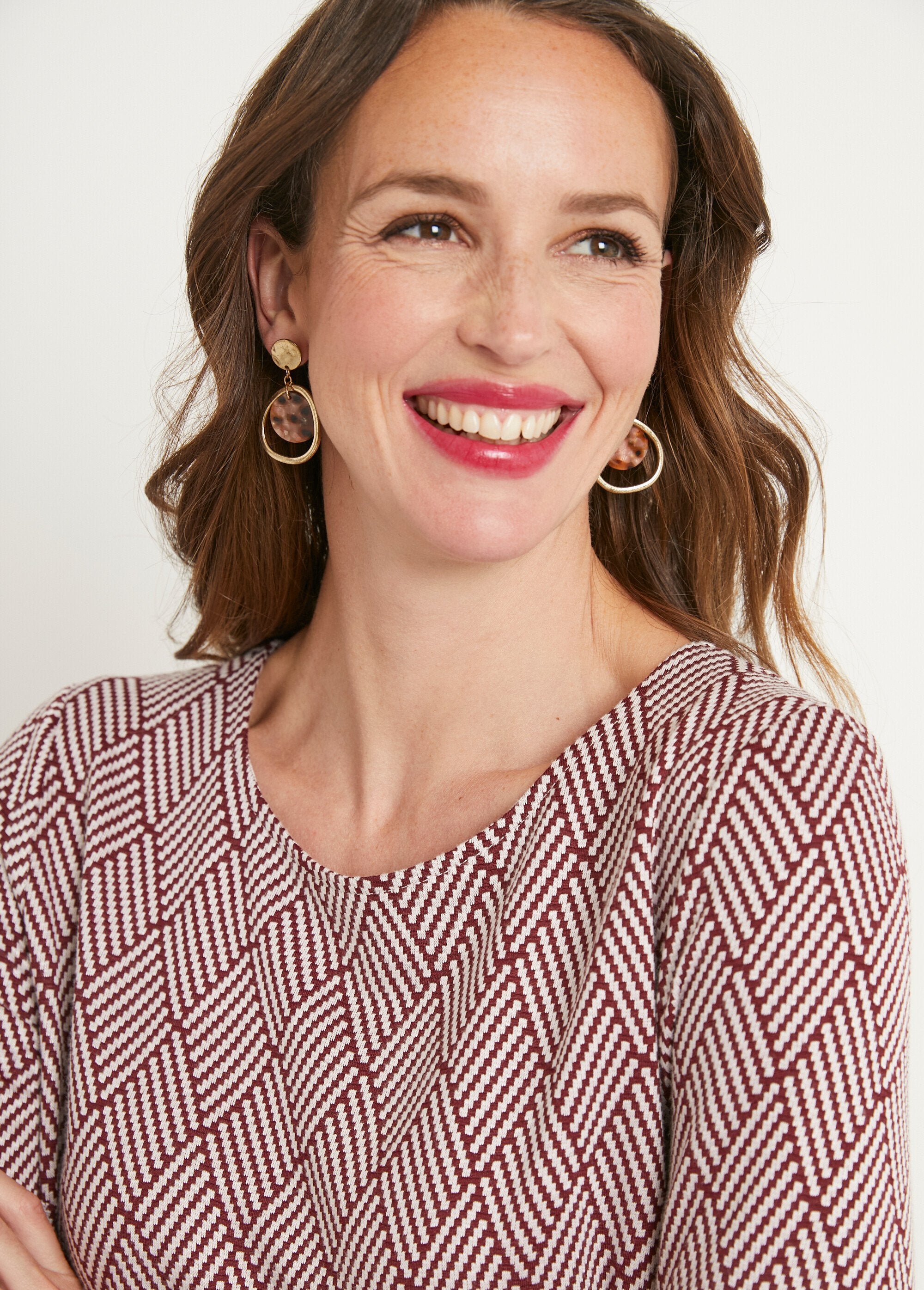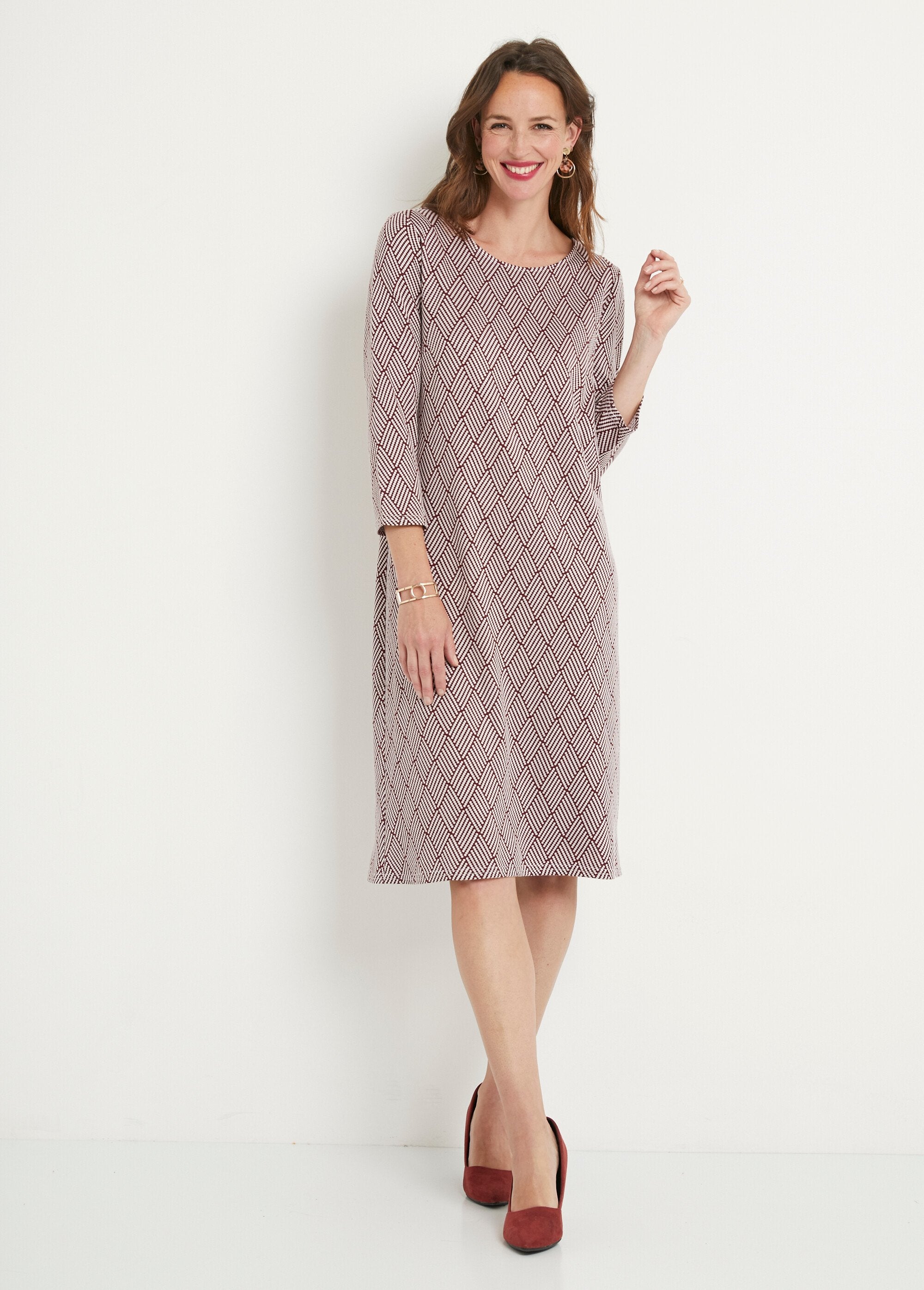 Short straight graphic jacquard dress  Bordeaux and ecru