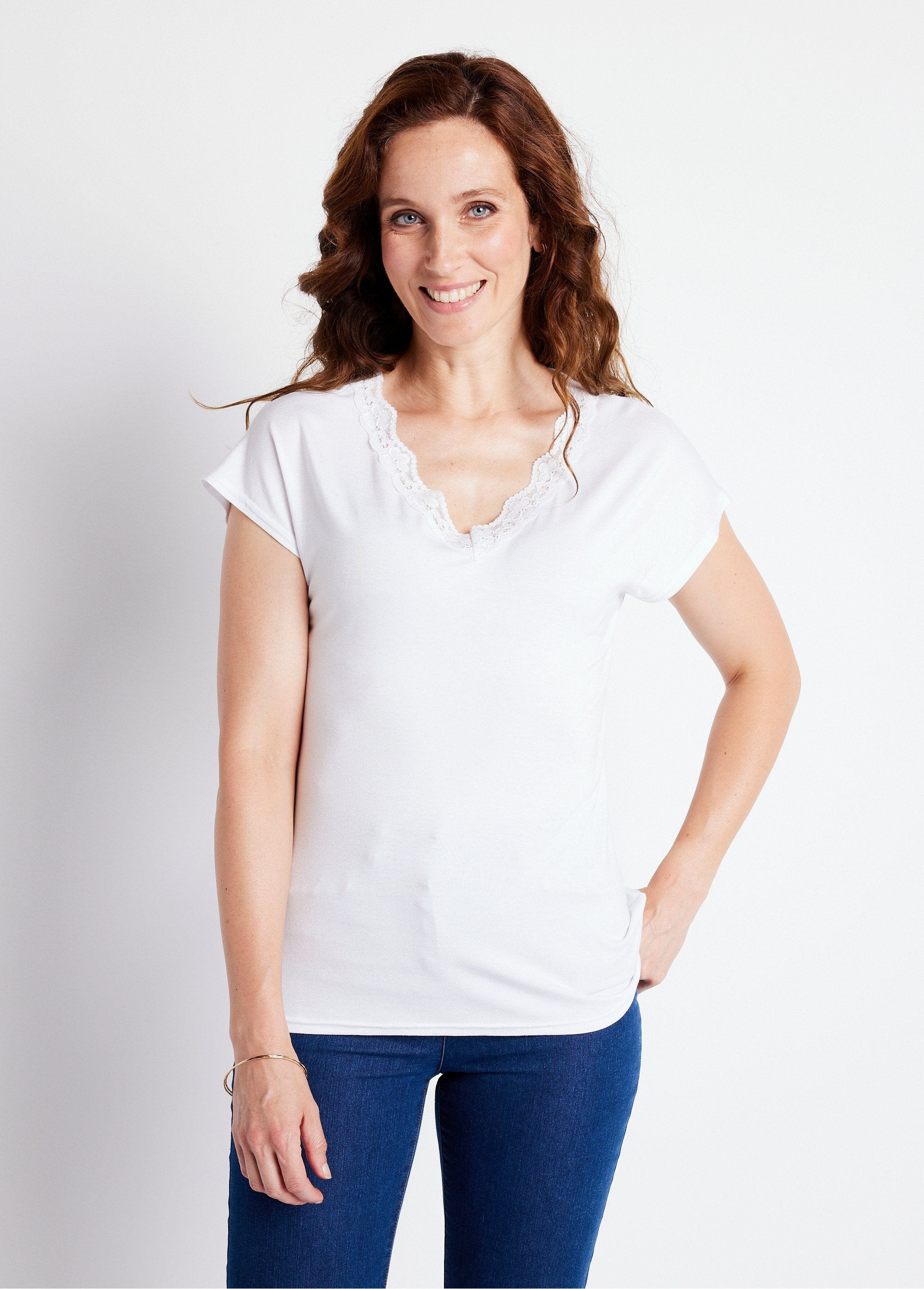 Available in plain and printed, the women's T-shirt adds a touch of fantasy to everyday outfits. To accentuate the feminine side of its lace, we pair it with a skirt. For more casual wear, we prefer jeans or pants.